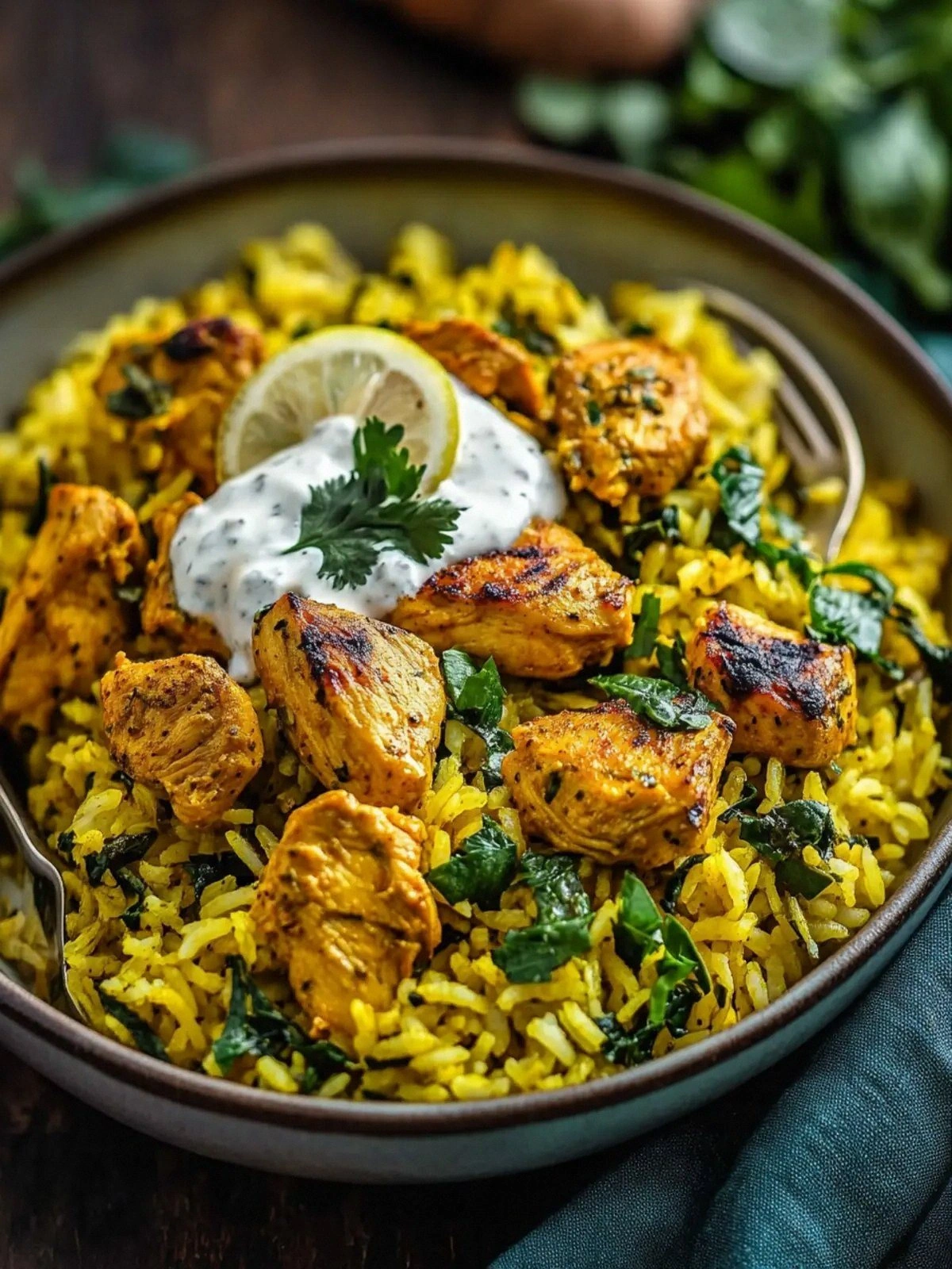 The first thing you notice is the aroma—spiced, earthy, and tinged with the sharp bite of fresh ginger. As the chicken sizzles, the sizzling sound becomes a rhythmic drumbeat, announcing the arrival of the turmeric’s golden glow. The colors on the plate are a vivid palette: the deep amber of turmeric, the emerald of spinach, and the bright citrus blush from the lemon. The texture is a harmonious blend of tender chicken, fluffy rice, and silky yogurt, all coated in a subtle sauce that clings like velvet. The final bite is a warm, comforting hug that lingers long after the plate is cleared.