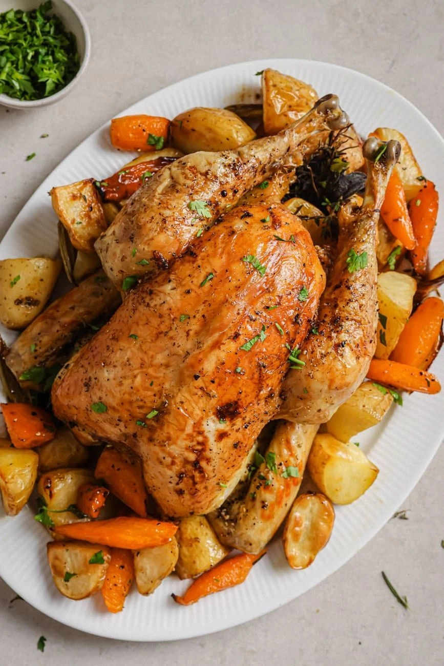 Swap the carrots and celery for diced butternut squash and add a sprig of fresh thyme to the cavity. The squash caramelizes into a sweet, buttery side that pairs beautifully with the savory chicken. The thyme adds a subtle earthiness that balances the sweetness. This variation is perfect for a cozy fall dinner.